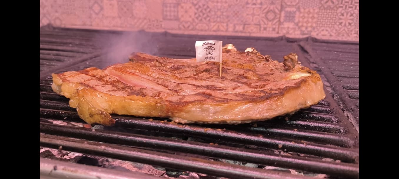 El corte suele ser grueso y con un buen nivel de infiltración. La grasa, en un chuletón de calidad, no es un estorbo, sino parte de su encanto. Ayuda a que la carne quede jugosa, marque un sabor más profundo y se funda con el calor de la parrilla. El Chato cuida especialmente este punto, seleccionando piezas que aseguran una experiencia completa. No es una carne que se coma deprisa; se disfruta.