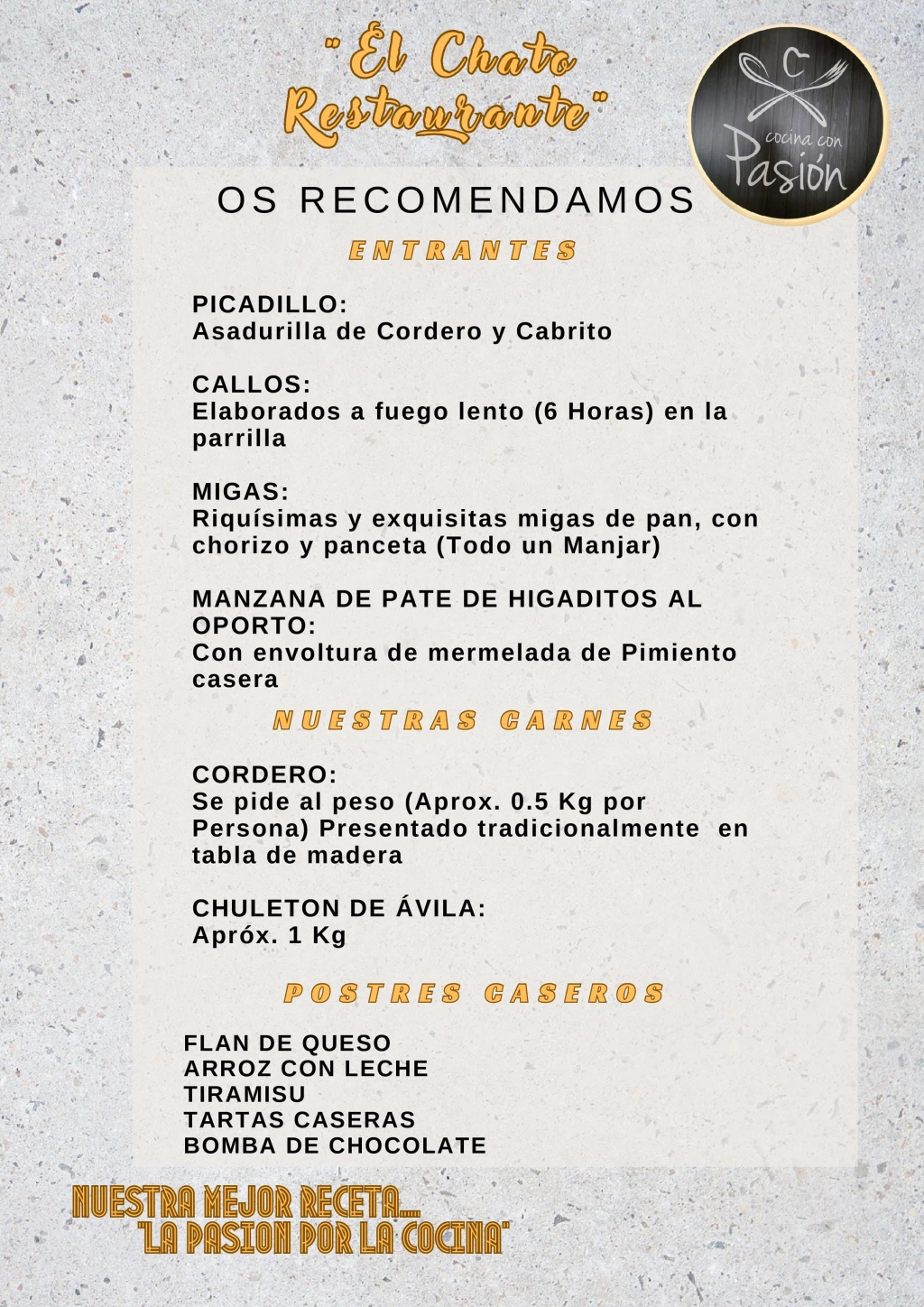 Nuestro restaurante, de estilo rústico y ambiente acogedor, ofrece una cocina que combina tradición y actualidad. En este restaurante en El Barraco Ávila estamos especializados en carnes a la parrilla, con especial protagonismo del cordero y el chuletón de Ávila, sin olvidar otros platos elaborados con producto de calidad y recetas reconocibles.